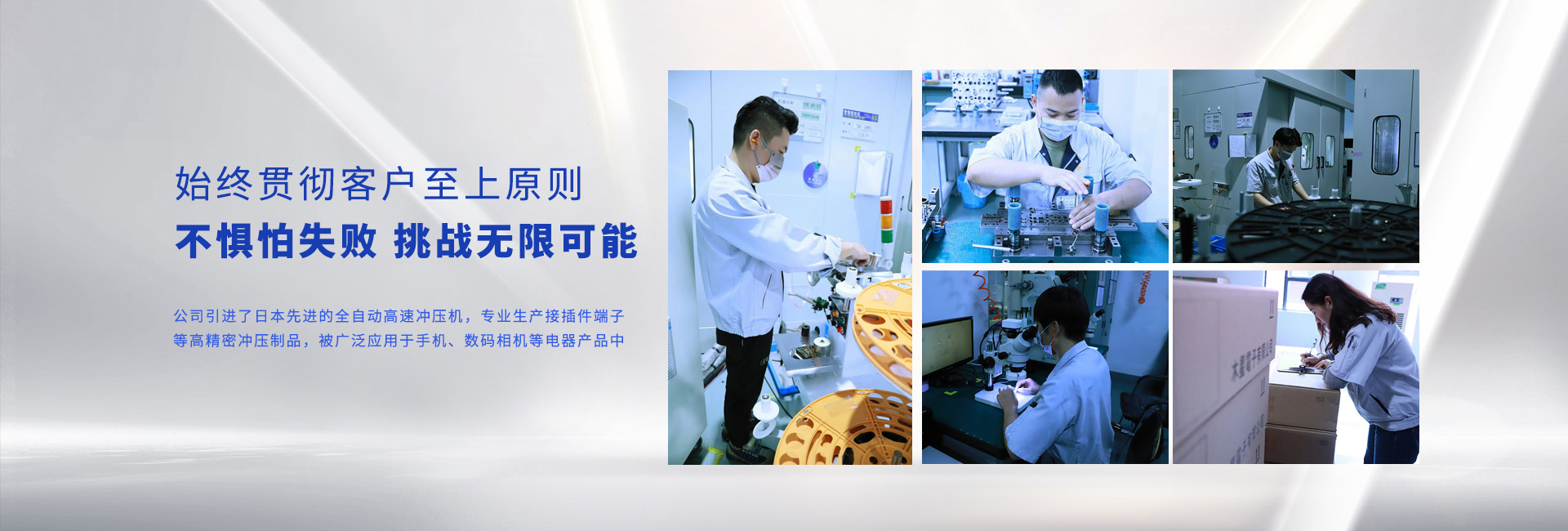 公司以《品质第一主义》为宗旨,建立起了不断向客户提供高品质低价格的产品体制。 公司总部日本Jupiter工业株式会社在日本有三十多年的端子冲压及精密冲压模具制作经验,并派常驻日籍技术人员在我公司进行技术指导,为我公司的稳步发展提供了强大的技术支持与保障。